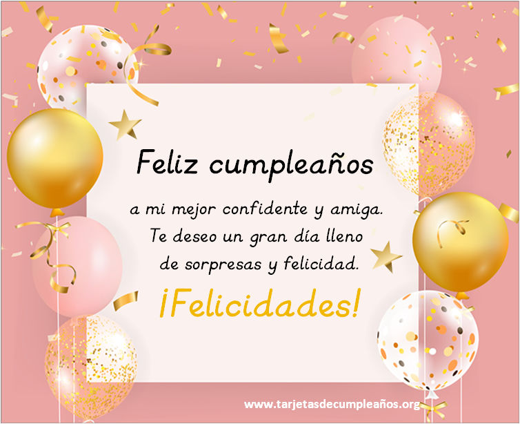 6 Feliz cumpleaños…a mi mejor confidente y amiga. Te deseo un gran día lleno de sorpresas y felicidad. ¡Felicidades!