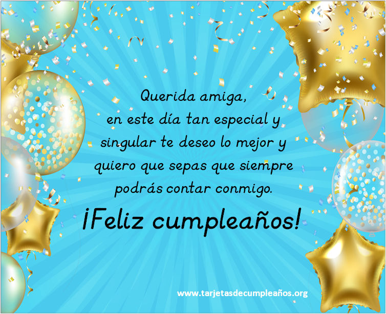 7 Querida amiga, en este día tan especial y singular te deseo lo mejor y quiero que sepas que siempre podrás contar conmigo. ¡Feliz cumpleaños!