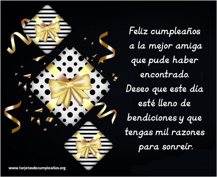 9 Feliz cumpleaños a la mejor amiga que pude haber encontrado. Deseo que este día esté lleno de bendiciones y que tengas mil razones para sonreír.