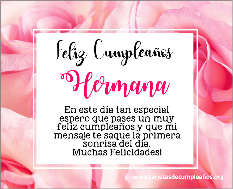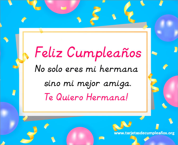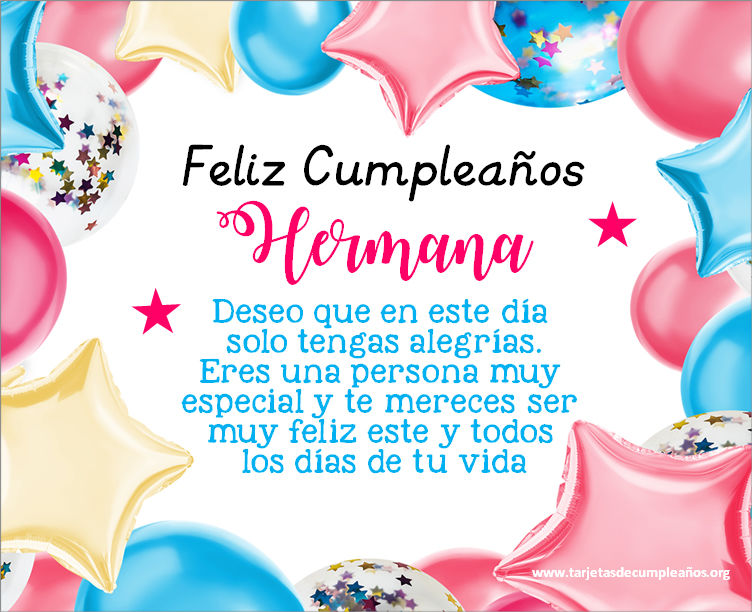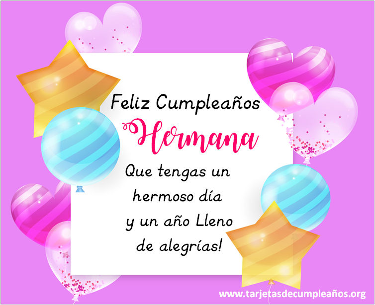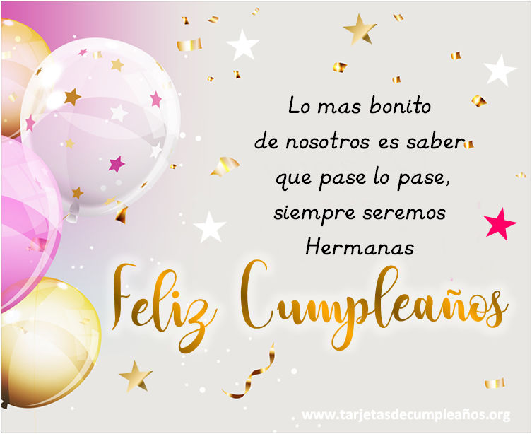 Hace llegar tu saludo a tu hermana de una manera original. Busca entre nuestras bonitas imágenes de feliz cumpleaños con frases especiales. Tarjetas postales de Feliz cumpleaños para tu hermana las podes descargar gratis y son perfectas para ser enviadas por cualquier red social ( whatsapp, facebook, instagram).